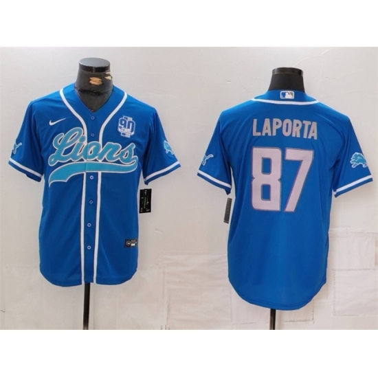 Detroit Lions #87 Sam LaPorta Blue With 90th Anniversary Cool Base Stitched Baseball Jersey