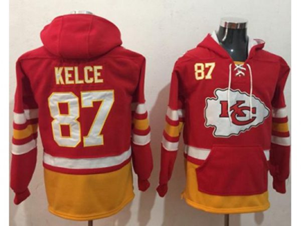Kansas City Chiefs #87 Travis Kelce Red Gold Name & Number Pullover NFL Hoodie
