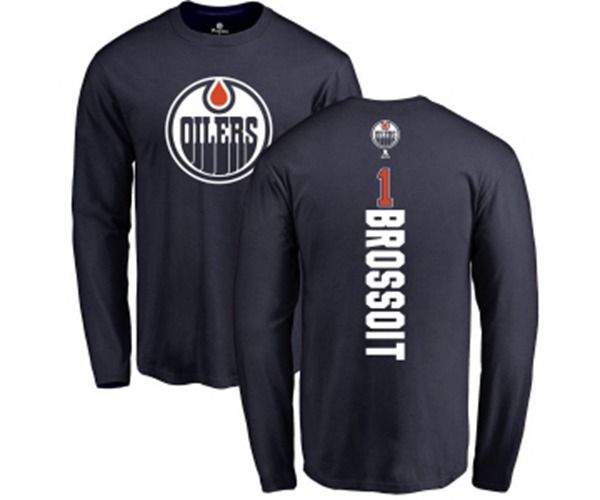 Edmonton Oilers #1 Laurent Brossoit Navy Blue Backer Long Sleeve T-Shirt